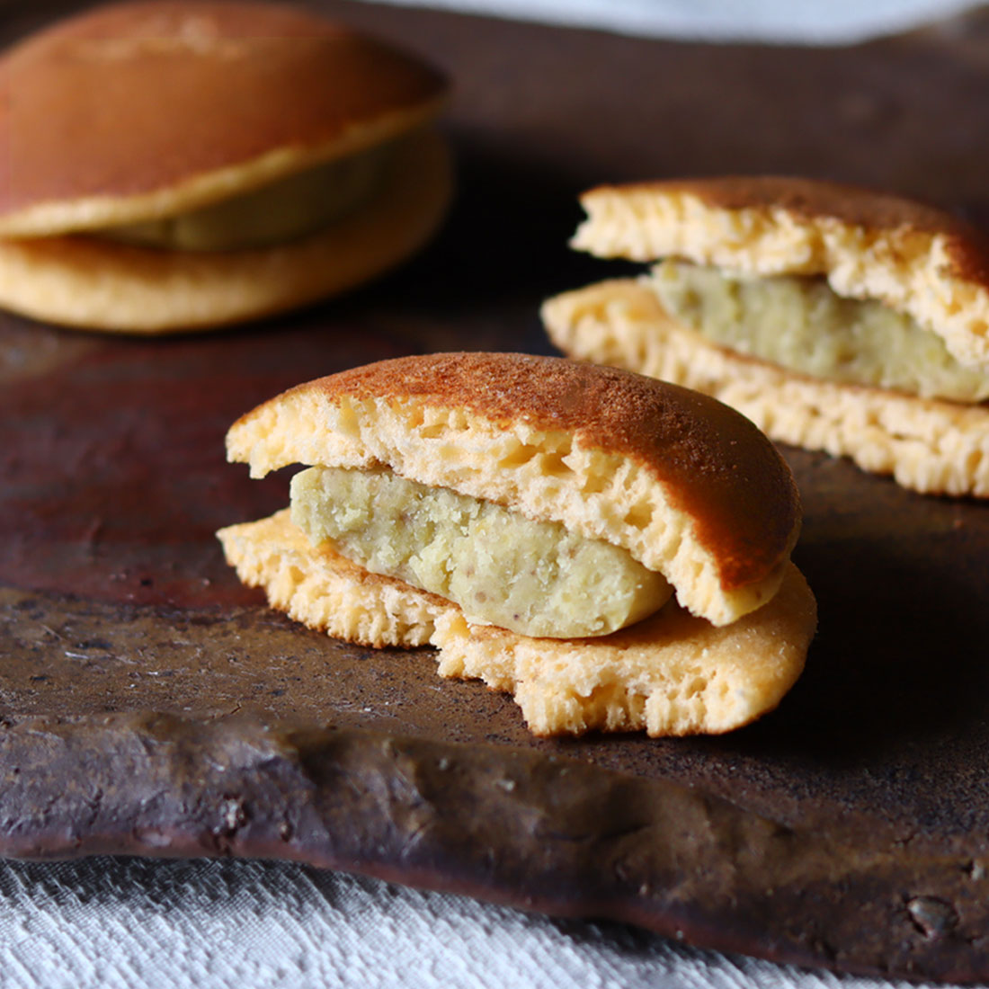 美味しく(美)、外観が優れており(玖:美しい黒色の石)、この品種が普及することで産地(里)が豊かになることを願い命名された美玖里。(※美玖里は栗の品種名です)国内で収穫された生栗は、保管時間を最小限にしてすぐ加工にかかります。品質が落ちないよう、温度管理を徹底し、保管期間、加工時間をできるだけ短くし、栗本来の色味、風味を損なわないよう栗のペーストに仕上げます。大事に加工された栗のペーストは、含まれる栗の粒をできるだけ残すように、ペースト自体に余分な力を加えず、職人が優しく手のひらで覆うようにどら焼きに仕上げます。