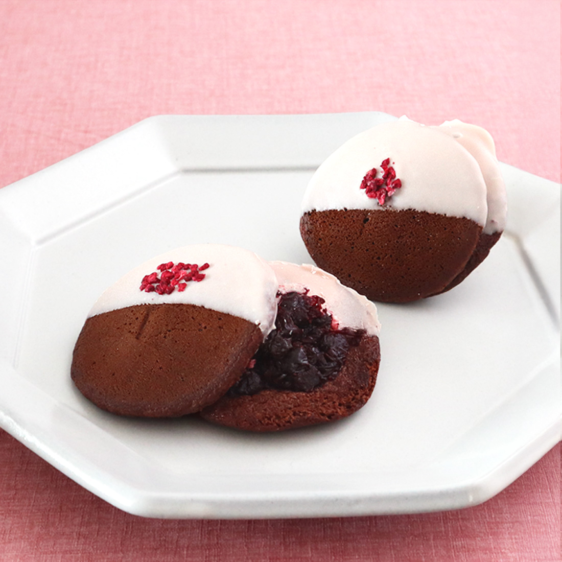 カカオで色づいたどら焼きの皮に、ほど良い酸味が心地よい長野県産チェリーキッスのジャムを挟みました。仕上げに、ホワイトチョコレートとルビーチョコレートを合わせた、ほんのりピンク色のチョコレートで丁寧にディップ。さらに、フランボワーズのフリーズドライをあしらい、見た目にも愛らしく仕立てています。