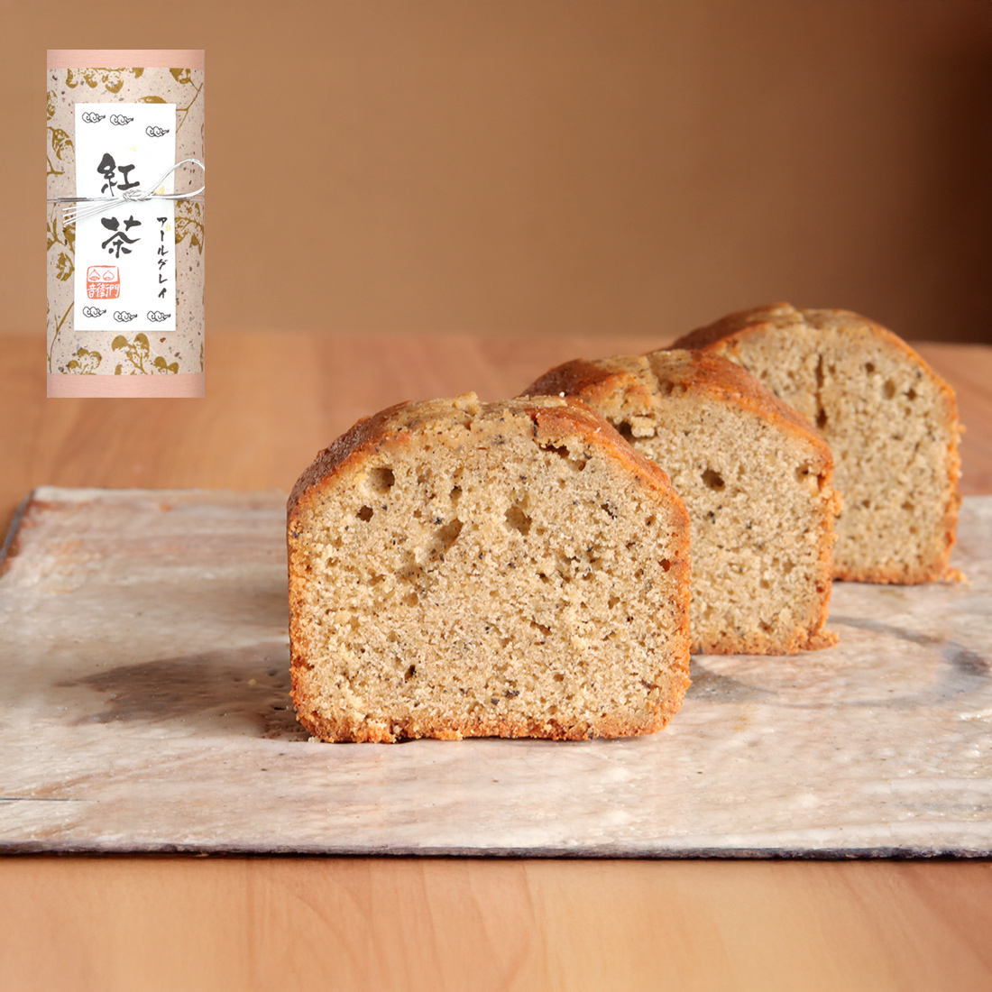 細かくくだいたアールグレイの茶葉を粉に加え、 さらにアールグレイの茶葉をミルクで煮出して エッセンスにして加えました。あとくちにやさしい紅茶の香りが広がります。アールグレイは、イギリスのグレイ伯爵が東洋の紅茶を絶賛し、それと同じ味を作ってくれとイギリスの紅茶商人に命じて作らせた紅茶が由来で、シチリア島で取れるベルガモットを用いて着香したという説があります。一口飲むと、ほっと心休まる味わいを、そのままパウンドケーキでご用意しました。
