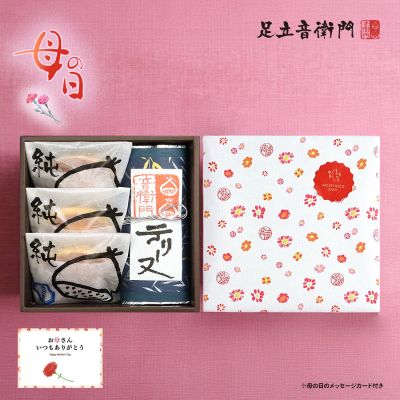 母の日のオリジナル包装にメッセージカード付きでご用意します。日頃の感謝の気持ちにお菓子を添えて、心を込めてお届けします。
