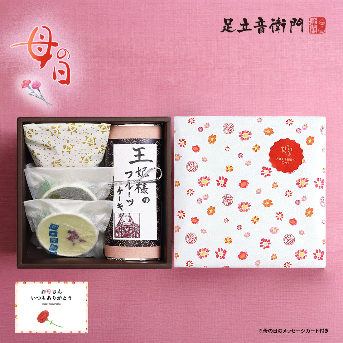 母の日のオリジナル包装に、想いを伝えるメッセージカードを添えてお届けします。日頃の感謝の気持ちに、心やすらぐお菓子を添えた特別なギフトセットです。