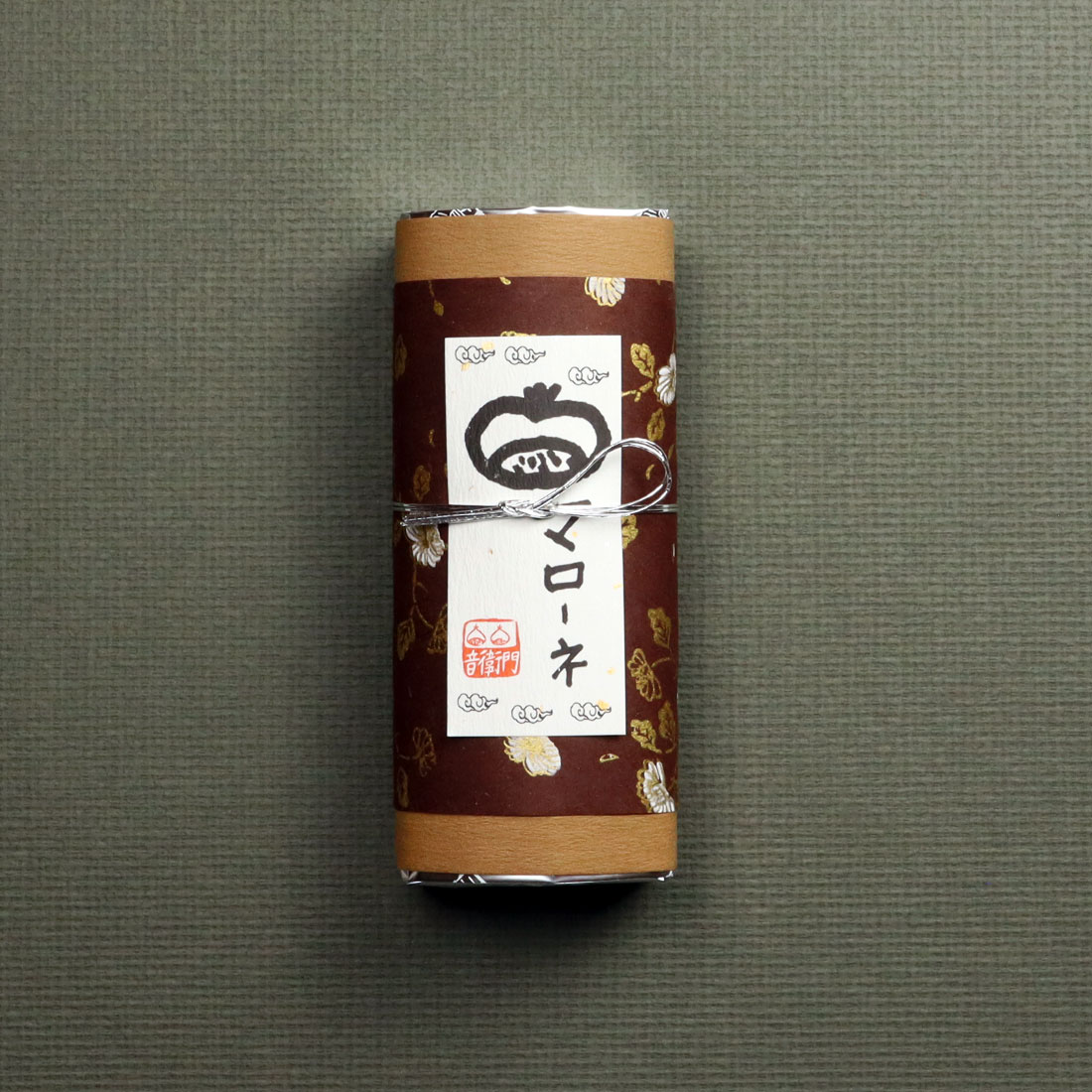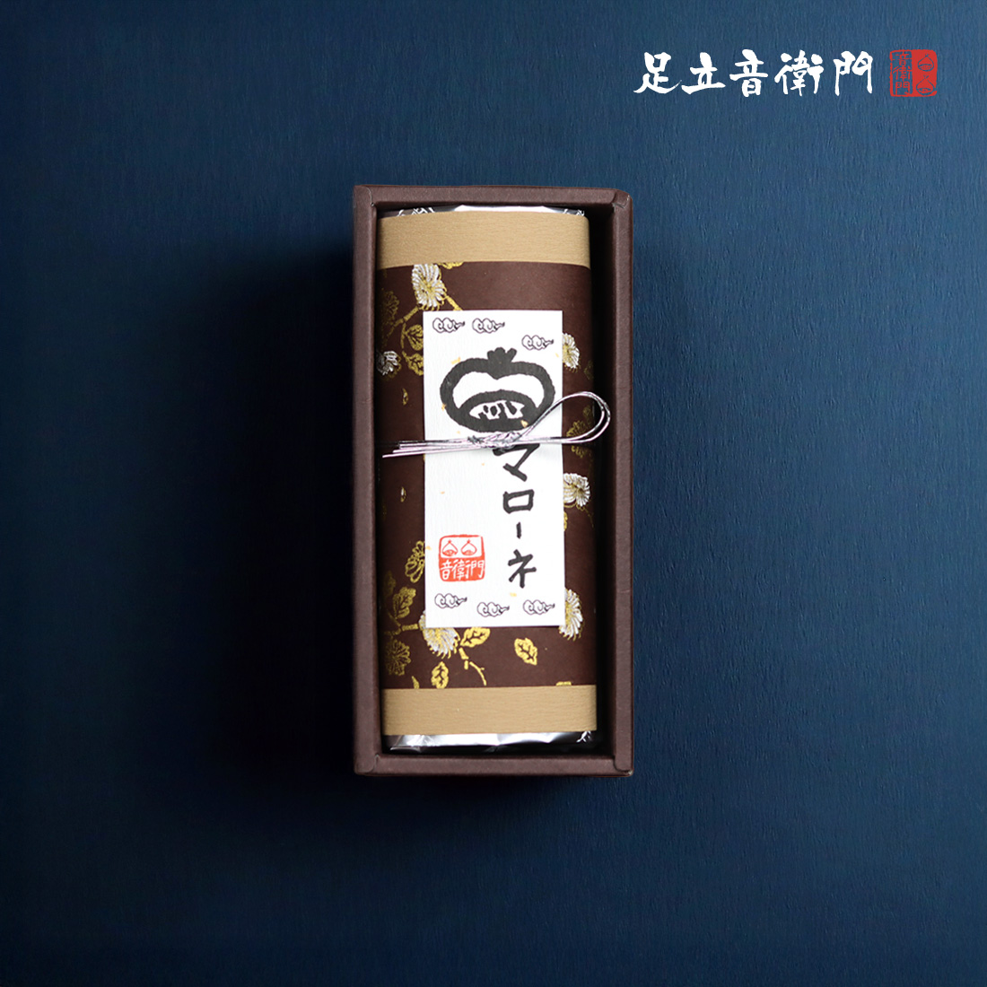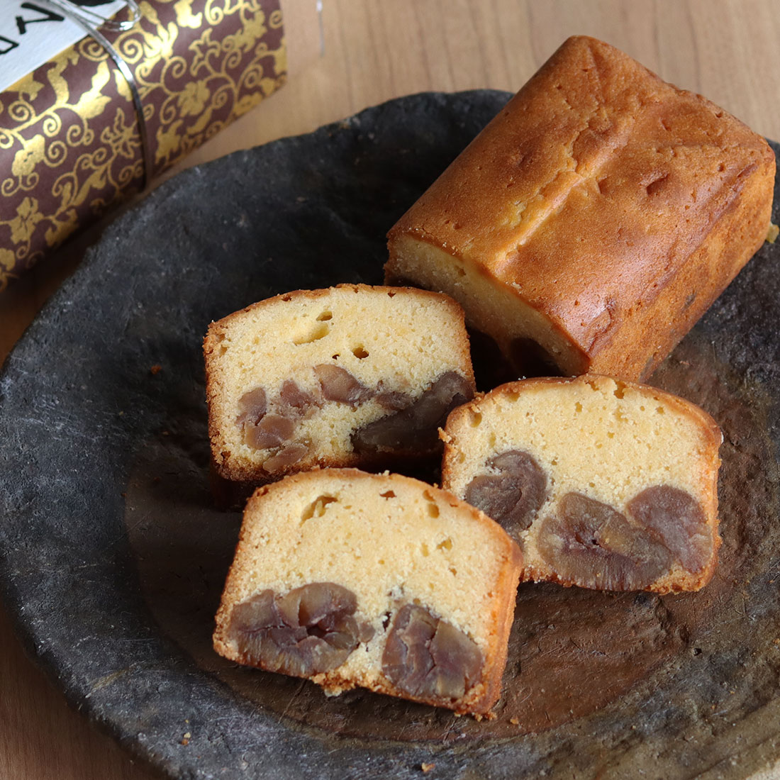 音衛門の栗おたくぶりがトルコの方にも通じたようで、この貴重なマローネ栗の砂糖煮を日本の皆様に味わっていただけるようになり、その栗を使用してケーキに仕立てました。どこを切っても栗が顔を出す、栗のパウンドケーキ。栗は、現地の女性が手剥きで仕上げて丁寧に割れないように布で包み、砂糖だけを使ってコトコト炊きあげた、ヨーロッパ種でも貴重な品種「マローネ」栗を使用。柔らかく、優しい栗の味わいを、発酵バターや和三盆糖も使用した上品なケーキで包みました。