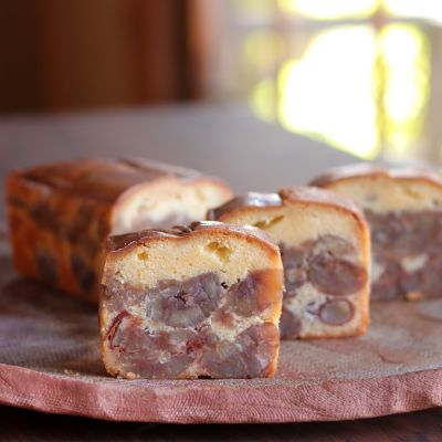栗のテリーヌと同じく、栗はヨーロッパ産、チリ産、国産の3種類の使用。 ケーキ1本に栗の量も400グラム超と、重量感もたっぷり。こだわりの素材で仕立てたパウンドケーキに、それぞれの栗の個性が加わって、豊かな味わいをお楽しみいただけます。