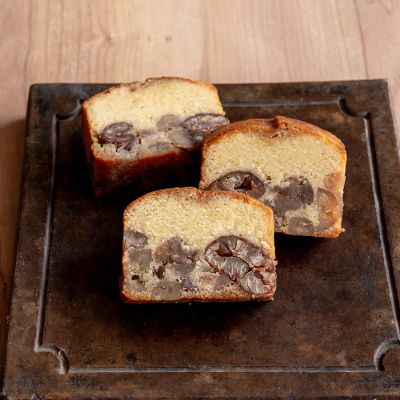 音衛門の栗ケーキの原点でもある、「音衛門の栗のケーキ」をハーフサイズでご用意しました。発酵バターや和三盆糖も使用した音衛門のパウンドケーキには栗がたっぷり100g。栗は優しい食感と甘さのマローネ種(トルコ産)と、しっかり食感のアンデス栗(チリ産)を使用。しっとりバターの香るケーキと、2種類の栗の味わいをお楽しみください。