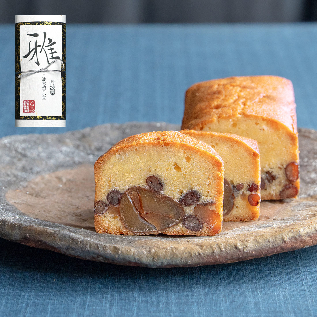 音衛門の地元、「丹波」の魅力を将来へ継ぐお菓子として、特産品の「丹波栗」「丹波大納言小豆」を一つにしたパウンドケーキをご用意しました。歴史や伝統が、人やものを通じて、代々後世に渡って行くよう願いを込めております。発酵バターや讃岐和三盆糖など厳選素材を使用したしっとりパウンドケーキに、丹波栗の甘露煮、丹波大納言小豆の蜜煮を合わせた一品。京都丹波の雅なひとときを感じていただければ幸いです。