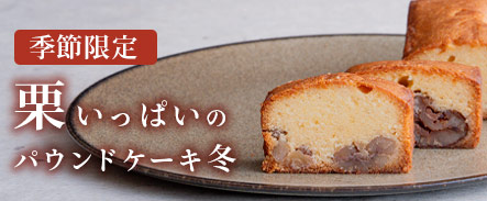 秋限定の栗のパウンドケーキをご用意しました。甘露煮を2種に、さらにマロングラッセを加えた3種の栗を使用。当店の栗のパウンドケーキに比べると、様々な努力と工夫が実り、お求めやすくご案内ができるようになりました。しっとりとした生地に、それぞれの栗が持つ甘み、香り、個性が重なり合い、ひと口ごとに秋の豊かさが広がります。素材の違いを感じながら、栗を求めて世界を旅するような時間を想像して、1本1本丁寧に仕上げています。季節のご挨拶や、大切な方への贈り物にもご利用ください。