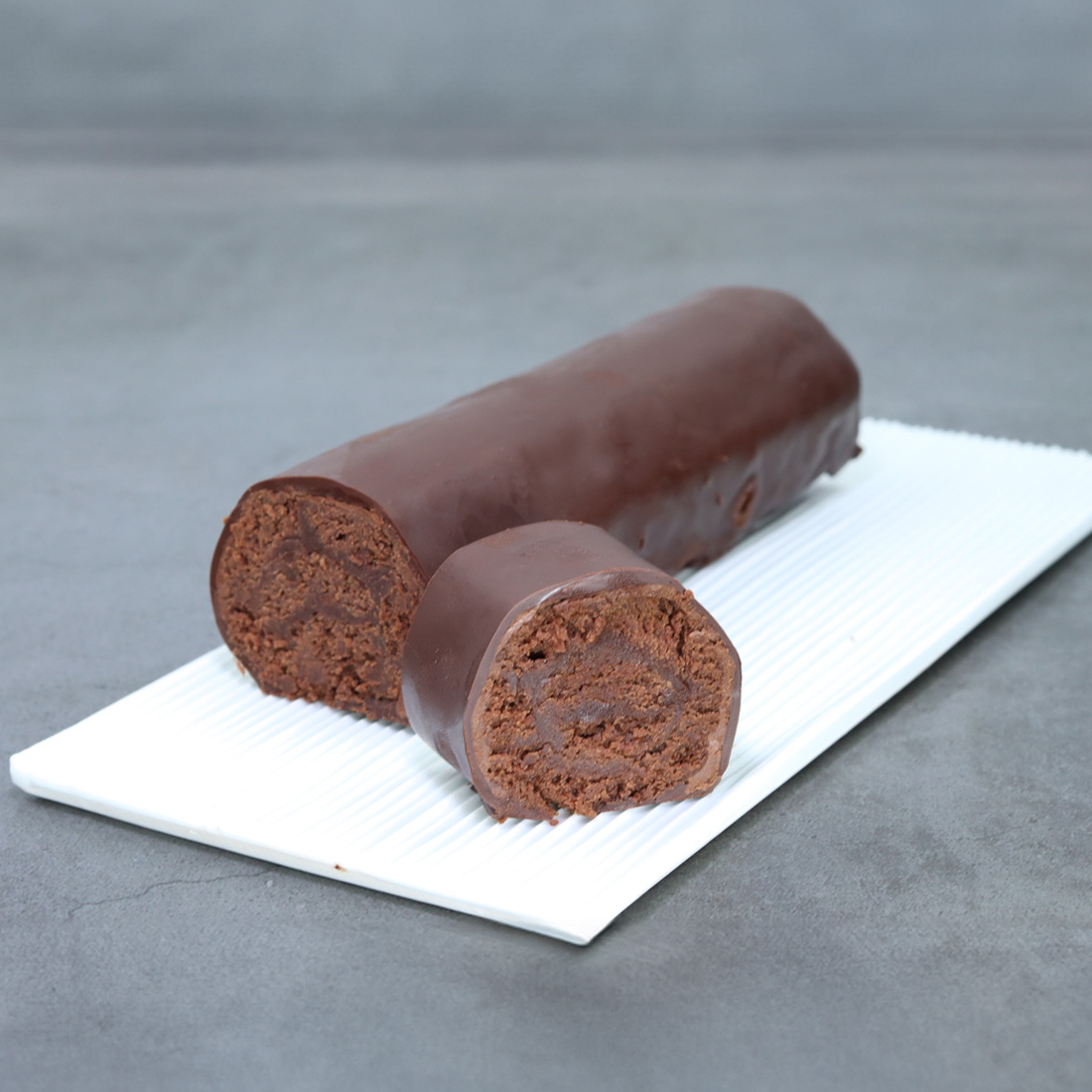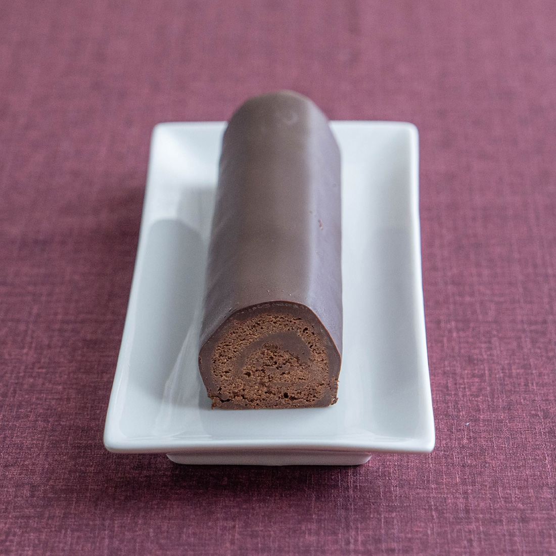 決め手のショコラはスィートタイプで一番まとまりの良いタイプのものを使っています! ジェノワーズ生地に使うマジパン・ローマッセは、ドイツ、モール社の最高級品を! ラム酒は手持ちの8種類の中からマイルドなホワイトラムを選択! 焼きあげたショコラたっぷりのジェノワーズ生地に時間と手間をかけて、大切に巻き上げて作り上げました。ホワイトラムを吹きつけ贅沢な配合のガナッシュを重ねて、ていねいに巻き上げます。落ち着いた生地にさらに仕上げのガナッシュを重ねた後、チョコをかけて完成となります。ジェノワーズを重ねてカットすると簡単にご用意出来ますが…お時間と手間をかけて大切に巻き上げて作り上げました!焼菓子ばかり作っていると、無性に、 トロリととろける生クリームやショコラの風味が恋しくなる時があります。 お気に入りの洋酒を使って、大人の贅沢なショコラのケーキを作ってみました。
