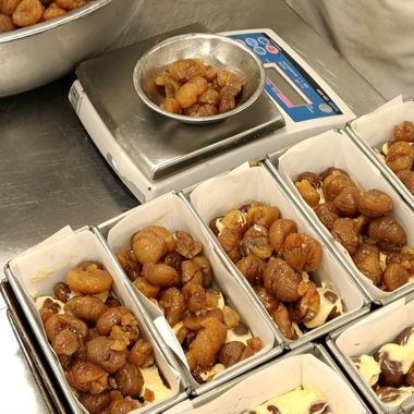パウンドケーキ型に2種類の溶かしたショコラの生地を流し、マローネの栗を並べてじっくり焼いたショコラのテリーヌ。カカオ分70%のフルーティーで酸味のあるショコラと、カカオ分66%の癖のない爽やかなショコラを合わせて、口どけの良さに、後口スッキリの仕上がりになりました。栗の食感、香りがショコラのケーキにアクセントを加えます。