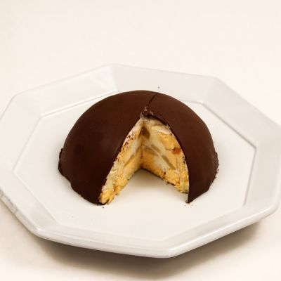 音衛門のヒミツのはしっこグルメ、ベレー帽のかたちをしたお菓子「ズコット」です。国産の美玖里(栗の品種)の味わいたっぷりのペーストに、創業文化元年讃岐三谷家の手造り和三盆糖、精白度の高い最高級の薄力粉などなど厳選素材を使ってふんわり仕立てた「モンブランロール」の切り落としたはしっこをたっぷり敷き詰めます。ケーキとケーキの間に、ガナッシュクリームや、栗の甘露煮も加えて形を整えます。最後に、ビターなチョコレートをかけて、ドーム型のお菓子に仕上げました。