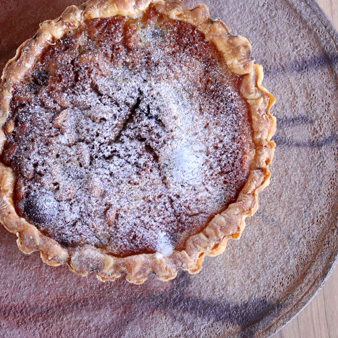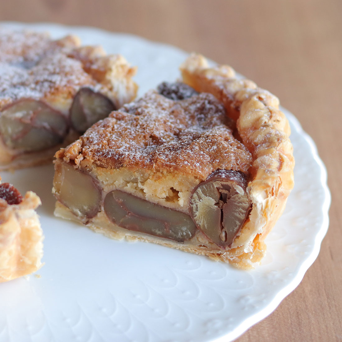 毎日焼き立てをご用意している栗のタルト。生地を支えるパイ生地をのばすところから始まります。チョコレートはアクセントに、栗はぎゅうぎゅう。香ばしい松の実とアーモンドプードルを加えて生地を流してオーブンへ。