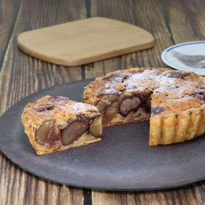 いよいよ今年の新栗がご用意できました。栗は品種によって、早生、中生、晩生と収穫時期が異なりますが、当店では、より味の濃い(当店基準で)中生以降の栗をお菓子に好んで使っています。そのため、秋の深まる10月中旬以降が、新栗を使ったお菓子の登場時期となります。大きな新栗の和栗を、パイ生地を敷いたタルト型にぎゅうぎゅうに敷き詰めて、栗たっぷりのタルトをご用意します。そこに隠したチョコレートと、散らした松の実が味わいのアクセント。ゴロゴロ栗をおもいっきり使ったタルトに、この秋に収穫された熊本県産の新栗のホクホクとした美味しさ、今年の日本の秋の実りをお楽しみください。