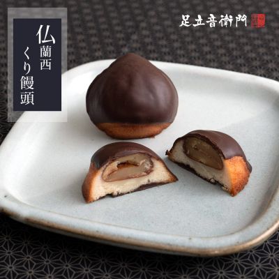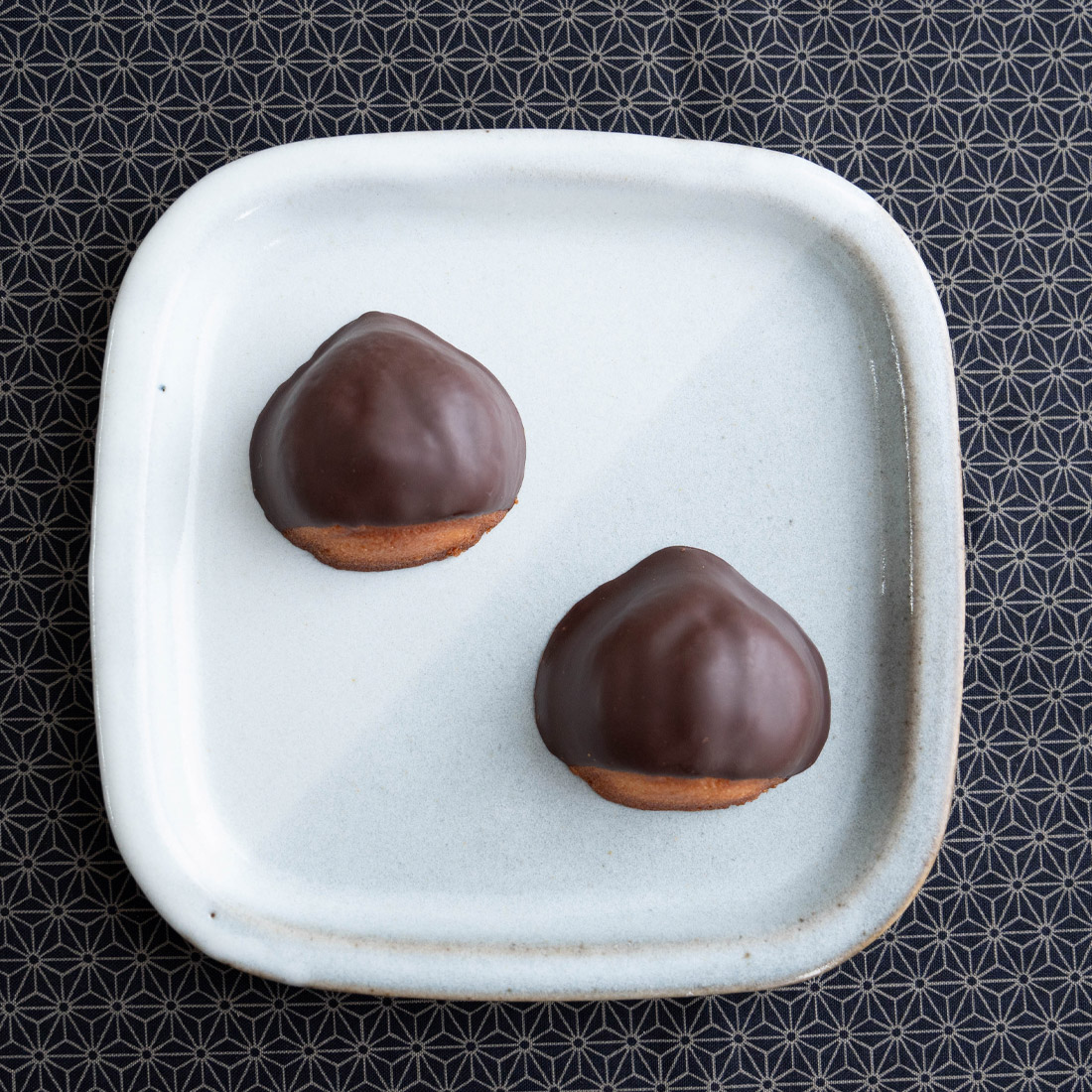 甘さ控えめで栗のホクホクとした風味を残した和種の栗のシロップ煮(甘露煮)を、フィナンシェの生地で包んで焼き上げ、ブランデーを吹き付けてさらにしっとりとさせた後、フランス製のショコラも使って、栗をイメージして仕上げました。栗のしっかりとした食感と、しっとりしたケーキを、どうして損なわないようにお届けできるか、工夫を重ねました。