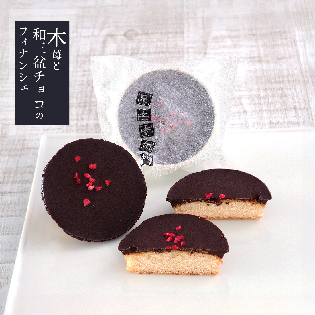 発酵バターや和三盆糖も使用した優しい口あたりのフィナンシェに、音衛門独自配合の和三盆チョコレートを重ねフランボワーズのフリーズドライを飾りました。濃厚なショコラの口どけと広がるカカオの風味に、爽やかなベリーの酸味をお楽しみください。