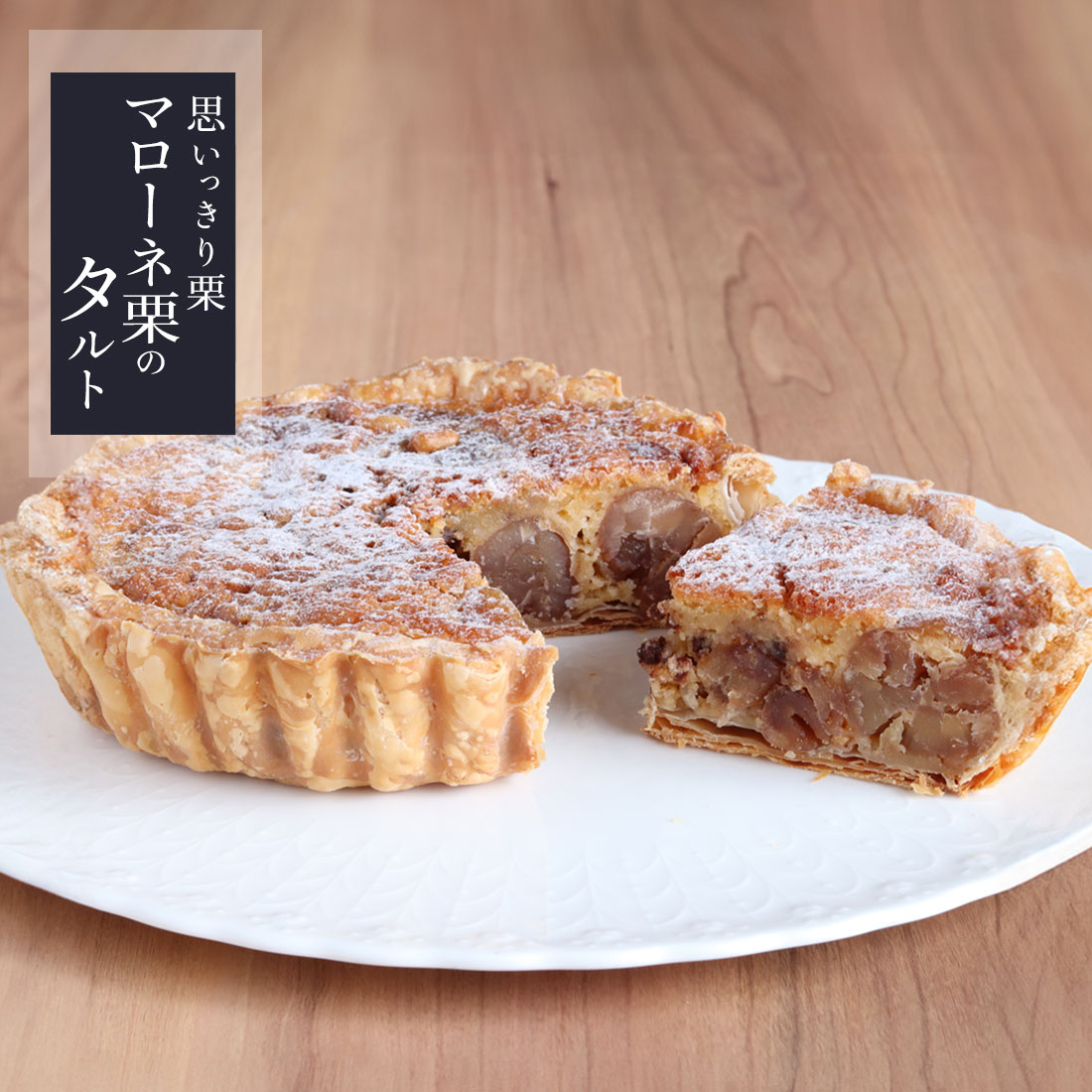 焼きたてを毎日発送しています。 マロンの語源ともなったマローネ種の栗を、一粒ずつ村の女の子が手作業で皮を剥き、ガーゼにくるんで煮崩れしないようにじっくりとシロップで炊いていきます。柔らかく、少し甘い目の仕上がりのマローネの栗をタルトでご用意します。お茶やコーヒーなど、お飲み物を濃いめにご用意して、一緒にお楽しみください。目安として4~6名様でお召し上がりください。