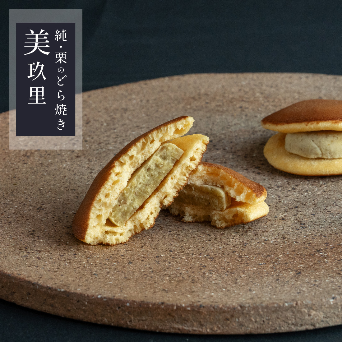 美味しく(美)、外観が優れており(玖:美しい黒色の石)、この品種が普及することで産地(里)が豊かになることを願い命名された美玖里。(※美玖里は栗の品種名です)国内で収穫された生栗は、保管時間を最小限にしてすぐ加工にかかります。品質が落ちないよう、温度管理を徹底し、保管期間、加工時間をできるだけ短くし、栗本来の色味、風味を損なわないよう栗のペーストに仕上げます。大事に加工された栗のペーストは、含まれる栗の粒をできるだけ残すように、ペースト自体に余分な力を加えず、職人が優しく手のひらで覆うようにどら焼きに仕上げます。