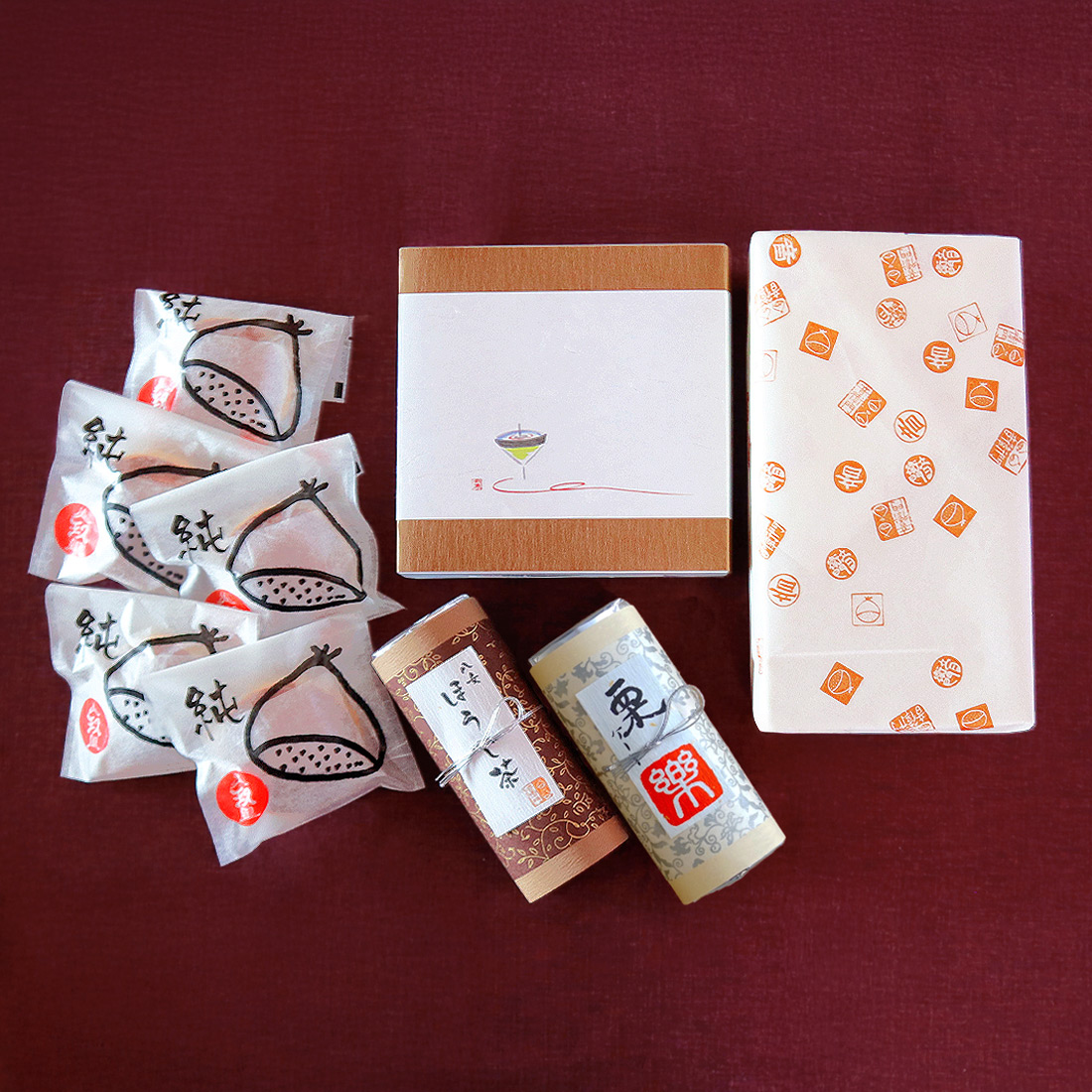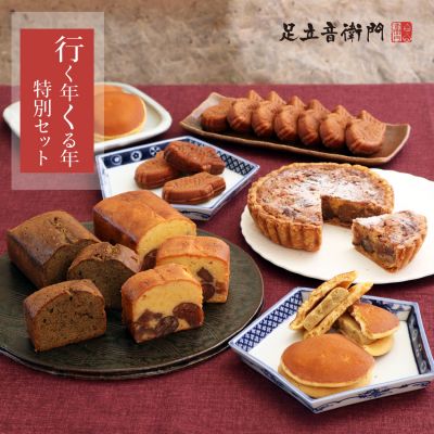 年末にご実家に帰省するかたや、久しぶりのご家族や親戚が帰って来るというご家庭に、お菓子盛り沢山の音衛門のお菓子を集めた特別セットをご用意しました。行く年、くる年。行く人、くる人。久しぶりの顔や、はじめましての顔も、みんなが笑顔になるように、人気のお菓子をまとめてお届けします。2種類の栗がたっぷりのWEB限定の栗パウンドケーキ「楽」を1本、香ばしい香りのほうじ茶を合わせた特別なケーキを1本、パイ生地に栗を敷き詰めた栗ぎゅうぎゅうのタルトを1台、大納言小豆を包んだ鯛焼は10個入りのギフトセットを1箱、栗餡だけを包んだ、音衛門らしい栗のどら焼きを5個ボリュームたっぷりの内容でお届けします。