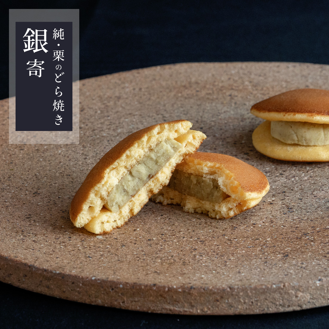 国産の銀寄栗と砂糖だけでご用意する栗ペーストを、そのまま餡に丸め、和三盆糖や発酵バターを使用した、上品などら焼きの皮で優しく包みます。温度、湿度によって火加減を変えるなど、職人が一つ一つ手作業でご用意するどら焼き。ふんわりとした食感、和のケーキのようなどら焼きは、国産栗の美味しさと、香りをお楽しみいただけます。
