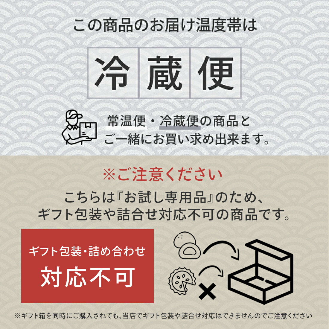 - 同じ温度帯の商品同士 での 同梱は可能です。 (ただし、同一注文に限る)