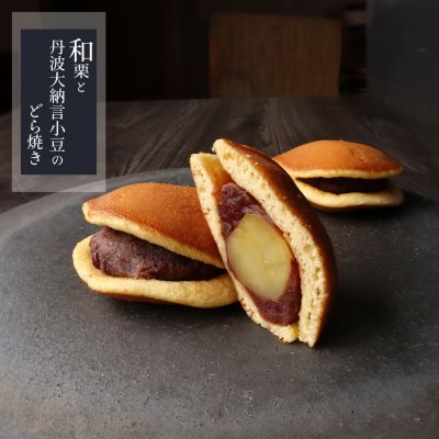 丹波大納言小豆の餡に、大きな国産ムキ栗の甘露煮を1粒、和菓子職人が1つずつ丁寧にどら焼きに仕上げます。和栗は自然の栗の美味しさをそのままに、小豆の風味をしっかり残した丹波大納言小豆の餡と一緒に、発酵バターや和三盆糖なども使用した和のケーキのようなふわふわのどら焼きの皮で包んでご用意します。 丹波大納言小豆は丹波地方発祥の晩成品種小豆の品種群名で、その歴史は古く、兵庫県・京都府を中心に栽培される大粒で至極美味な高級品種の小豆です。京の都や江戸へと献上されて重宝されてきました。江戸城中では大納言は太刀を抜いても腹を切らずに済むことから、煮えても腹切らぬ(皮が割れない)この地の小豆に大納言の名が与えられたといわれています。 丹波大納言小豆の年間市場出回り量は約800トンと、大産地である北海道の小豆の7万トンに比べその流通量は1%程度。晩成種のため生育期間が長く、山間の一人当たりの耕作面積は現在も少ないまま。 昼夜の温度差が大きい丹波地方のみで採れる小豆は、大粒で俵型の美しい形。赤い色が濃く、強い光沢があり、風味にも優れています。